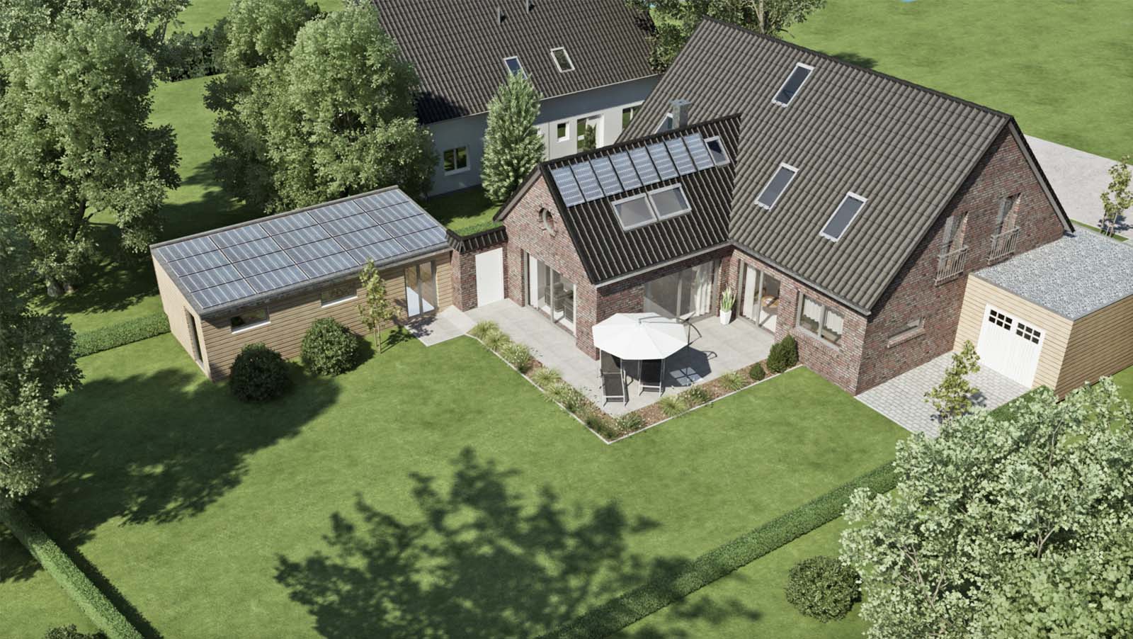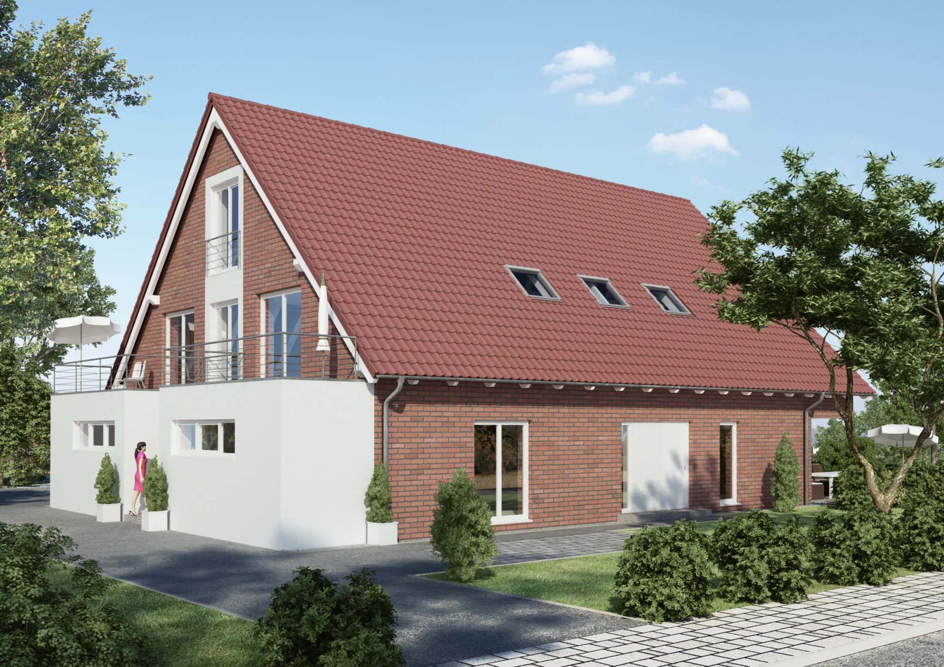 Auftragsvolumen: 3 Standpunktperspektiven, 1 Vogelperspektive, Materialvarianten Klinker- / Putzfassade